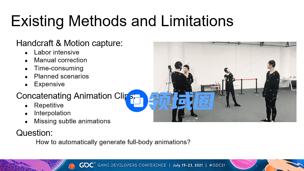 首先,我们一起来观察游戏应用中,已存在的动画参数制作方法和限制。传统方法中,动画参数依赖于经验丰富的动画师手动制作完成。一般来说,一段时长10秒的动画通常需要两天甚至一周的时间才能够完成,更为精细的动画,需要更长的手动制作时间。 近些年来,随着动作捕捉技术的发展,制作一条10秒的动画依然需要半天时间,包括数据捕捉和手动矫正。总体来说,手动制作和动画捕捉都非常耗时。聘用经验丰富的动画师和建立动作捕捉系统经济成本都非常高。更为值得关注的是,手动或动捕制作的动画数据仅仅能应用于特定的剧情,复用性差。这些原因就导致了玩家经常看到的动画片段重复使用,损失了动画数据对剧情的匹配性,同时又缺乏了动画的多样性。