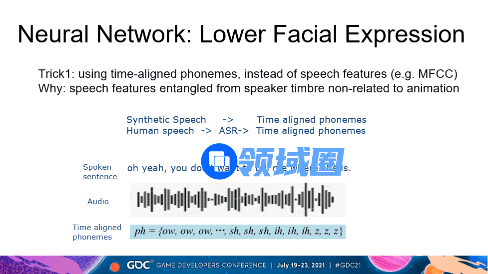 这里,我再着重强调一个细节。一旦我们从语音中提取到音素序列,根据音素持续的时间,我们可以获得时序对齐的音素。操作层面上,根据音素持续的时间,我们重复音素标签,如图所示,我们就能够得到时序对齐的音素序列。为了方便计算,我们将这个音素序列的频率设置为与动画序列的频率一致。这张幻灯片展示了一个例子“oh yeah, you don’t want to tell me where she is”。根据语音信号,语音识别工具可以输出时序对齐的音素序列。就像幻灯片中观察到的一样,音素按照它们持续的时间重复对齐排列。