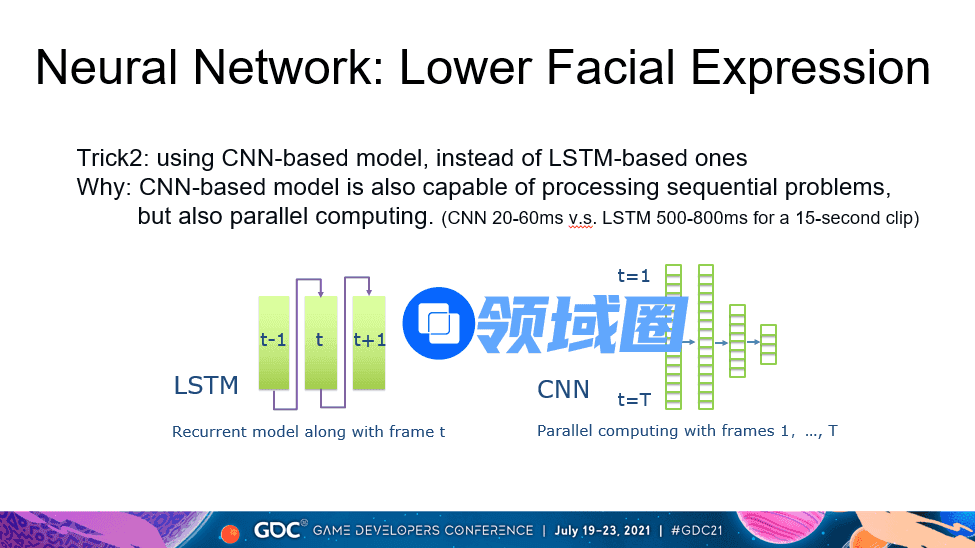 之前也提到过,神经网络用来提取音素和动画参数的时序关系。一般来说,我们会考虑使用LSTM,长短记忆网络。它是一种典型用来模拟时序关系的神经网络。事实上,大量的学者都已经尝试使用过LSTM处理时序关系,并且有着大量成功的实验结果。另一方面,值得注意的是,LSTM是一个递归神经网络,它逐帧输出时间序列。下一帧的输出依赖于前些帧的输出。这样一个递归的计算模式导致计算过程非常耗时。因此,我们尝试使用另一个神经网络结构,卷积神经网络,CNN。CNN通过并行计算完成时间序列的输出。在我们的实验中,对于一段15秒的序列来说,LSTM花费500至800毫秒,然而,CNN只需花费20至60毫秒。