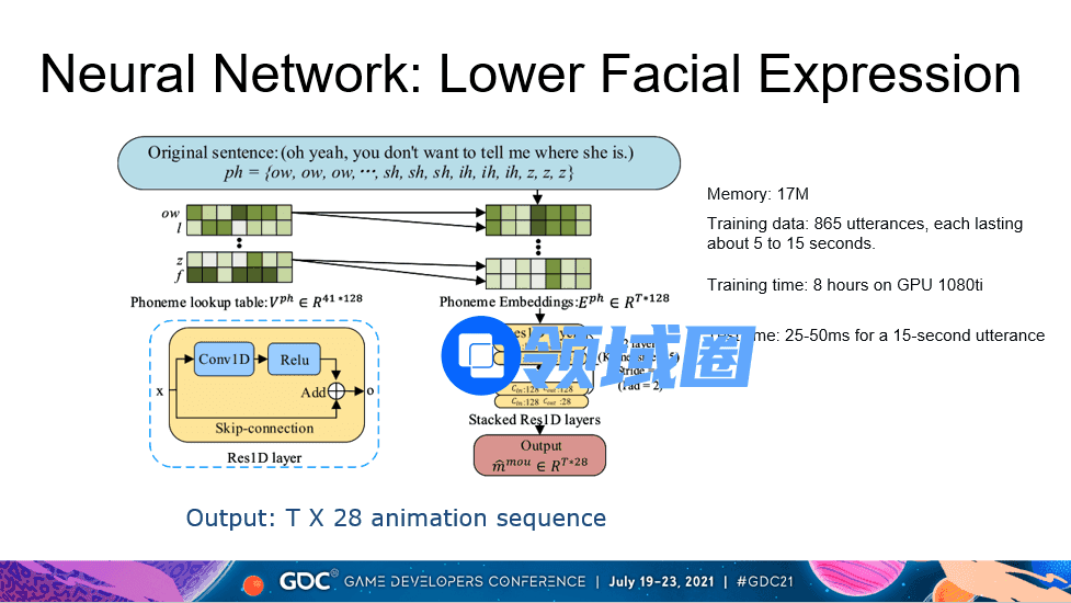 这张幻灯片展示了具体的神经网络结构,输入是一段时序对齐的音素序列。我们方法采用了12层神经网络,每一层都是一残差层。它的输出是持续T帧的28维动画参数序列。在我们的实验中,T取30。训练数据包含865句样本,每一句都持续5至15秒。