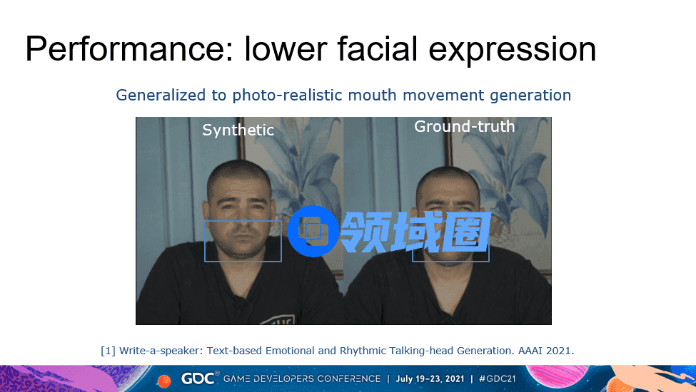 进一步,我们也尝试将嘴唇区域动画合成算法扩展到没有预定义三维角色模型的二维像素级说话人脸视频合成中,该工作也发表在AAAI2021,题目为write-a-speaker: text-based emotional and rhythmic talking-head generation。这段视频依然展示了一组视频,左边人物展示了由以上介绍算法合成的效果,右边是由相机录制的真实说话人视频。我们可以观察到算法在二维视频效果中,依然展示了高质量的效果。