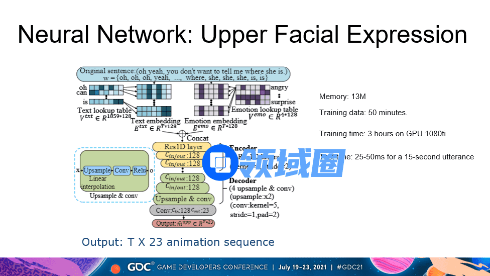 这张幻灯片显示了上半部脸面部表情的神经网络结构。输入是时序对齐的文本序列,输出是持续时间T帧的23维动画序列。这个神经网络是一个典型的编码-解码网络结构。在图中,编码器由黄色标记,解码器由绿色标记。编码器从文本信号中提取有意义的信息,并由一隐层编码表示,然后再由解码器将隐层编码转换/解码成输出的动画参数序列。训练集由50分钟有效数据构成。
