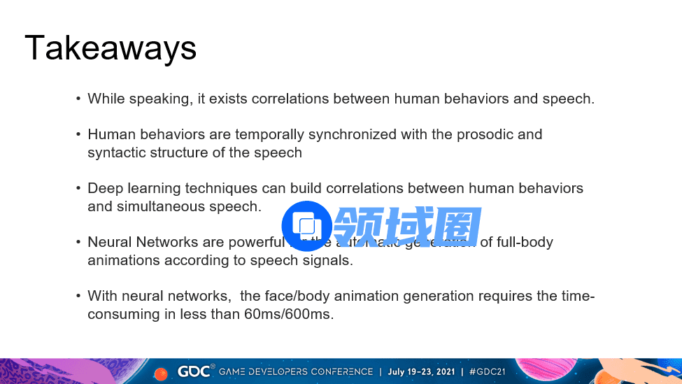 总体来说,我们的工作说明了以下几个方面:1)说话状态下,同步的动画和语音之间存在着相关性,表情行为同步与说话内容和语音韵律节奏;2)深度学习技术能够建立人类表情行为和同步语音之间的相关性,并能够根据语音信号,自动生成表情行为动画参数;3)依赖于深度学习技术,针对一句话,表情行为动画参数生成可以低于60毫秒。
