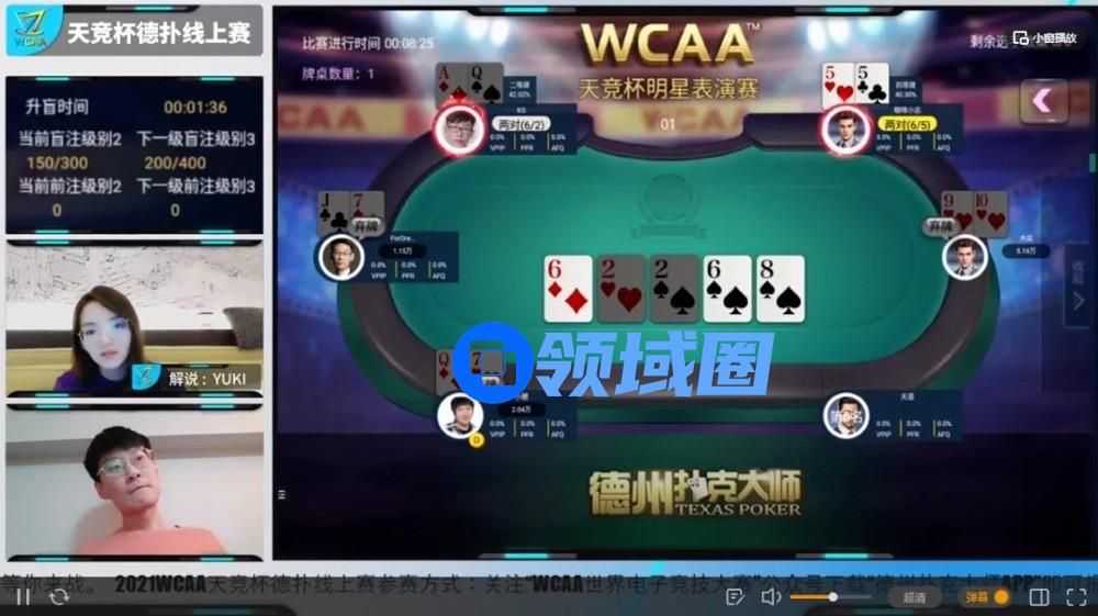 在本次“天竞杯”中,明星参赛,知名解说,顶级公会,全民狂欢,虎牙直播,多元化的元素充斥整个赛事,也是这些精彩的亮点将比赛打造成2021年最火热的德州扑克线上赛事,成为行业中一道靓丽的风景线。尤其是此次“天竞杯”在虎牙全程独家直播,主办方WCAA还邀请到了金牌美女解说YUKI和资深德州玩家四胖为前来观战的小伙伴进行明星表演赛解说,凭借着明星选手与国内一线公会的玩家间的精彩竞技,官方虎牙直播间内人气高涨,并引来众多德州爱好者热议,直播峰值一度高达60万。