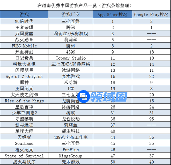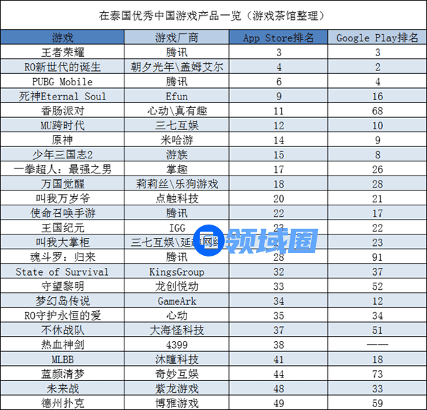 在本期榜单上,三七互娱的《MU跨时代》和腾讯的《王者荣耀》分别是出海越南和泰国的国产游戏中收入第一名。在东南亚地区,中国游戏占据统治地位。