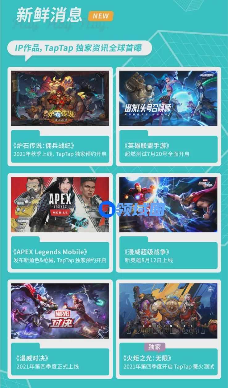 在7月8日 的发布会预告片中就引起无数玩家热议的《APEX英雄》,正式公布了《APEX Legends Mobile》的实机演示画面,新角色、新枪械首次曝光,目前游戏已在 TapTap 开启预约。7月15日上线的漫威IP游戏《漫威超级战争》和另一款卡牌对战手游《漫威对决》亮相了发布会。随着漫威电影《X战警:黑凤凰》在中国上映,这两款漫威IP手游分别公布了全新的英雄角色。《漫威对决》还宣布将于 2021 年第四季度正式上线。作为火炬IP的手游新作《火炬之光:无限》去年首次亮相 TapTap 游戏发布会,在今年其制作团队带来了游戏研发的最新进展,并宣布将在今年第四季度开启篝火测试。
