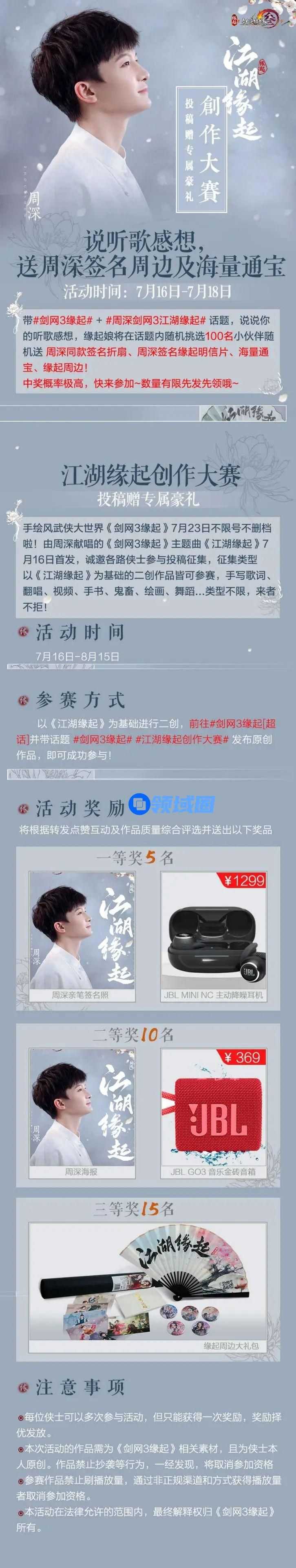 值得一提的是,【《江湖缘起》创作大赛】也于今日正式开赛!根据活动规则,投稿以《江湖缘起》为基础的二创作品如翻唱、视频、舞蹈等等,就有机会获得周深亲笔签名照、周深海报、JBL千元降噪耳机等专属豪礼!