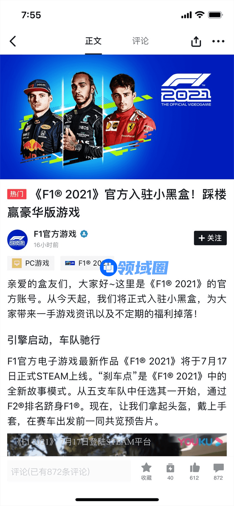 目前,《F1® 2021》官方已正式入驻小黑盒APP,喜爱游戏的玩家可以通过关注小黑盒APP官方账号:F1官方游戏,随时了解游戏最新资讯。同时,在活动帖下留言 “你最想pick的车手”或者游戏的相关其他内容,踩中【楼层数为11%、31%、51%、71%、91%】的5位玩家将获得官方送出的《F1® 2021》豪华版Steam激活码1份,现在就去参与踩楼赢好礼吧!
