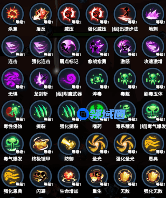 在《火柴人归来》中,有六种类型的战技可供玩家挑选,分别是通用、防御、生存、毒系、普攻和技能。通用型一般可以提升基础战斗能力,如攻击力,暴击率。防御型顾名思义,可以提升火柴人的减伤度与生命值。生存类一般带有护盾、免伤效果。毒系类可以造成敌人中毒,并具有可观的伤害。普攻型则是赋予普通攻击更高的伤害,更快的攻速以及多种通过普攻出发的效果。技能型战技一经学习,可以在战斗中打出指定技能,造成特定的攻击效果。四种战技各有特点,玩家可以自由搭配,打造出属于你自己的火柴战神!另外,学习某些组合的战技可以解锁技能连招,使得战技效果更上一层,争锋终极之战,成就格斗之王!