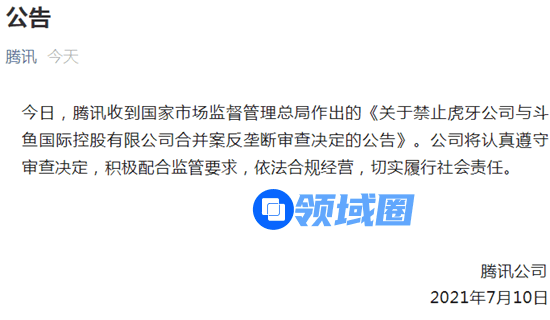 今(10)日,国家市场监管总局依法做出禁止虎牙、斗鱼合并的决定。对此,一直推动虎牙、斗鱼合并的腾讯回应表示,将“认真遵守审查决定,积极配合监管要求,依法合规经营,切实履行社会责任”。