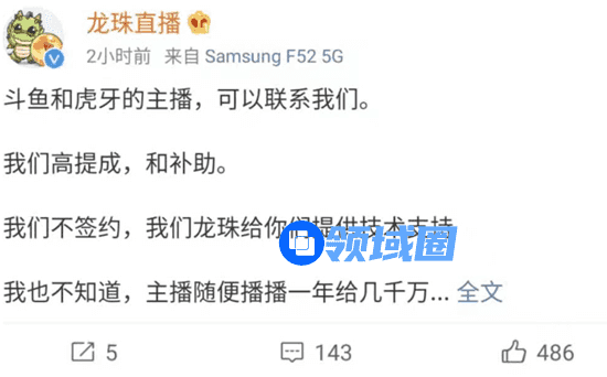 在虎牙斗鱼合并案被依法禁止后,龙珠直播首先表态支持,并已向虎牙、斗鱼的主播发出招募贴,许诺高提成和补助。