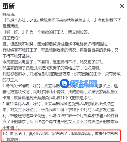 两周前,《开心消消乐》的游戏更新文案引起了大家关注。这篇更新文案言辞非常卑微,求爷爷告奶奶希望老玩家回归游戏,甚至连“玩家爸爸”的口号已经跃然纸上。