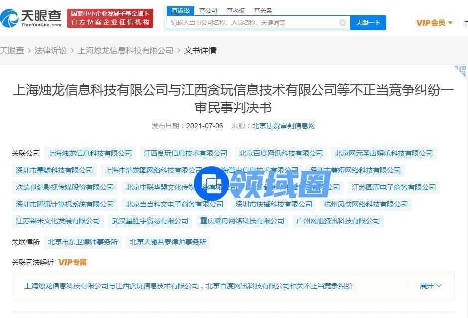 据天眼查App显示,7月6日,上海烛龙与江西贪玩公司等不正当竞争纠纷一审民事判决书公开,案号(2020)京0108民初8654号,审理法院为北京海淀法院。