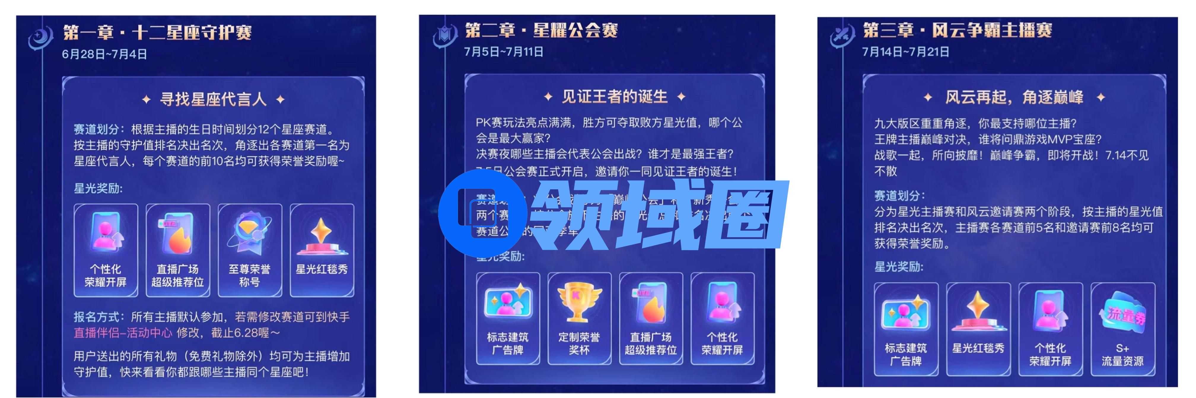 拿这次活动来说,快手从6月28日正式开展的游戏星光大赏活动,共分为分十二星座守护赛、星耀公会赛以及风云争霸主播赛,但不管是任何赛事,快手官方都将对参赛,并获得名次的主播,无论大小,都给予相当大的支持!