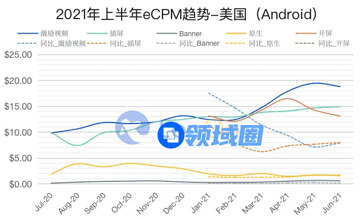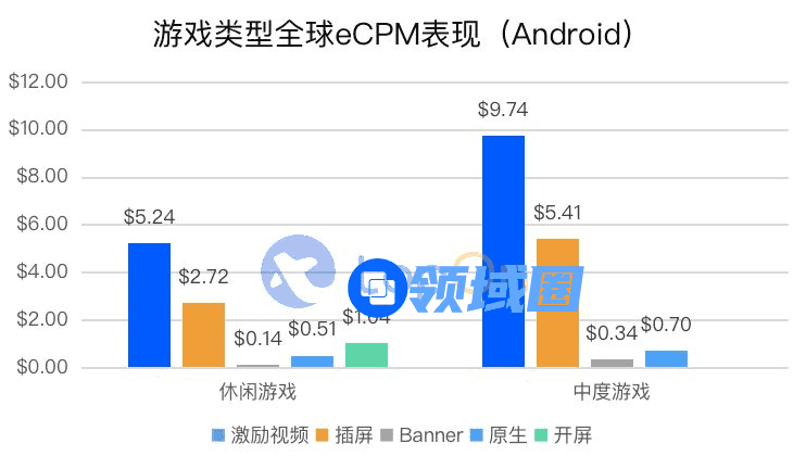 2021年休闲游戏与中度游戏整体稳定,各广告样式eCPM差距相较2020年基本保持不变,激励视频与插屏总体eCPM略有增长$1-2。