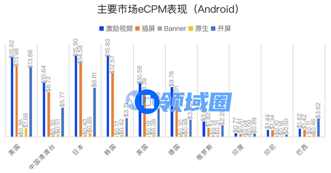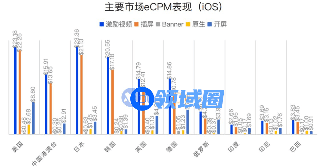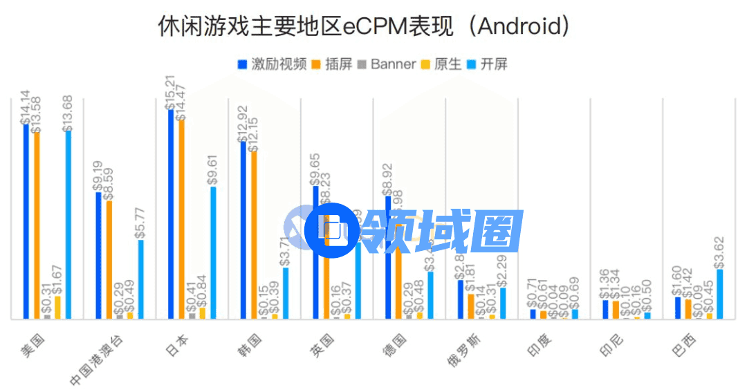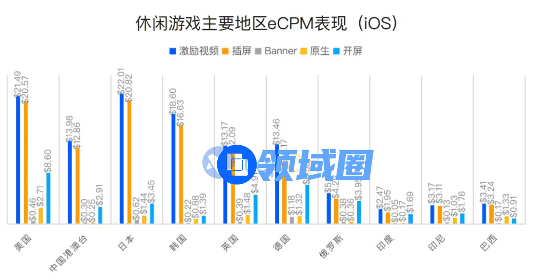 从广告变现eCPM来看,美国相较2020年表现上升明显,与日本相差无几,韩国整体表现仅次于日美位居第三。印度、印尼、巴西的eCPM同比表现并无明显增长,iOS端激励视频与插屏eCPM表现甚至仅略微高于头部市场原生eCPM表现。