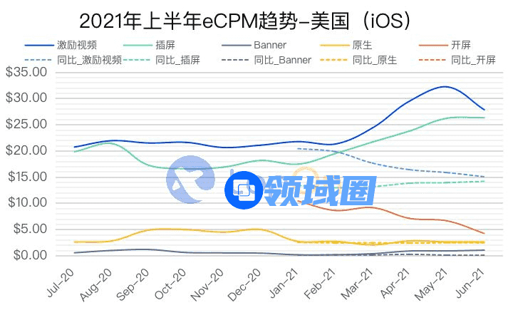 4月底Apple发布iOS 14.5正式版以来,欧美市场iOS端eCPM普遍在5月达到峰值,随后在6月开始下滑。日韩中国港澳台iOS端峰值则出现在4月,5月轻微下滑后6月回升。