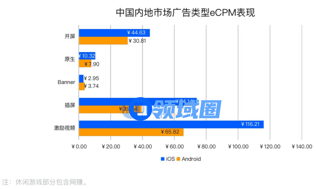 iOS端整体表现也要好于Android端。休闲、中度游戏激励视频、插屏eCPM高出将近1倍。激励视频iOS端eCPM高达¥116.21,较2020年度提升约18%;Android则小幅提升约8%,为¥65.82。