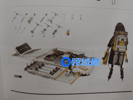 就拿小企鹅麦哲伦的部分来说,细节设定不仅贴出了其所使用无人机的详细拆解图,更是把玩家一直好奇的手提箱直接铺开,得以让我看到全貌;里面包含有大量的电路元件,集成电路,太阳能充电器以及储备的无人机等,细节拉满。