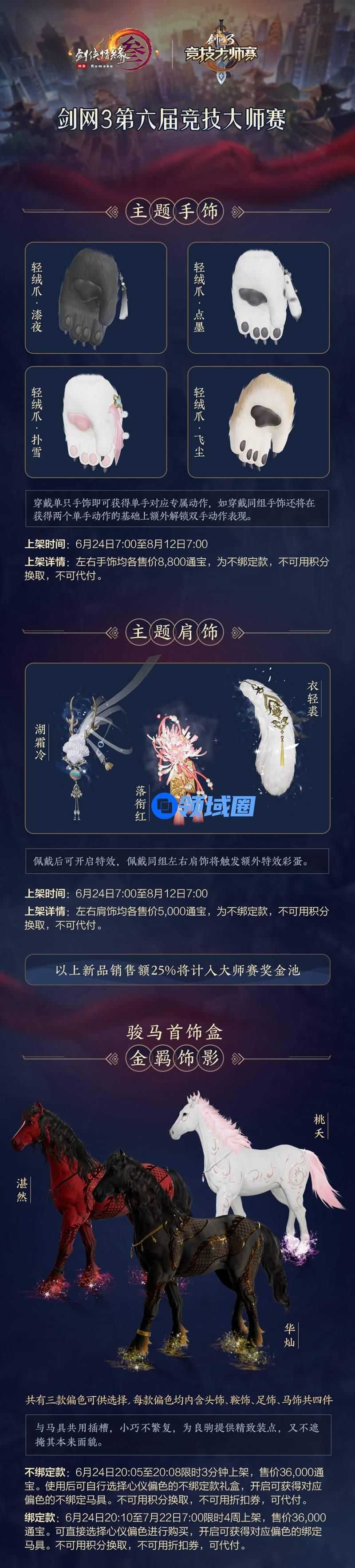 不仅如此,为迎接第六届大师赛的到来,《剑网3》更有靓丽新品登场增添更多趣味,全新手饰“轻绒爪”系列、大师赛主题肩饰“落衔红”、“衣轻裘”、“湖霜冷”以及全新骏马首饰盒“金羁饰影”系列可谓令人眼前一亮!新品亮相引江湖惊叹,就请跟随资讯君的脚步,一起来了解更多细节吧!