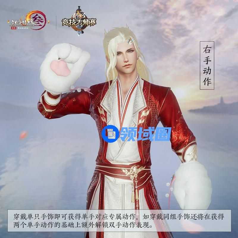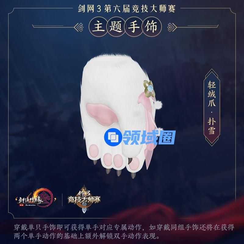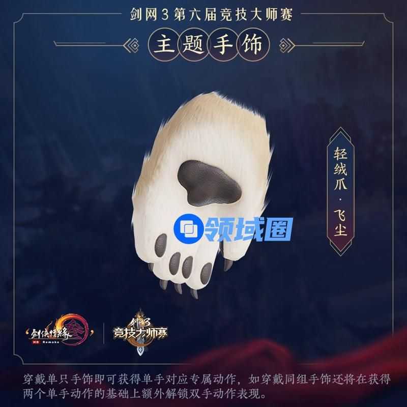 萌兽来袭,共迎大师赛,全新手饰“轻绒爪”系列激萌登场!作为全新饰品分类,手饰“轻绒爪”以Q萌可爱的兽爪为形,增添诸多亮点,四款手饰各取不同萌兽主题,佩戴后更可体验专属待机动作!值得一提的是,侠士穿戴单只手饰即可获得对应专属动作,待机动作将根据侠士佩戴手饰位置不同而变化,如穿戴同组手饰还将在获得两个单手动作的基础上额外解锁双手动作表现!
