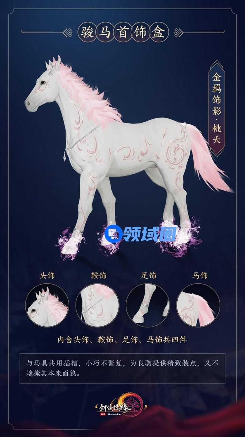 共有三款偏色可供选择,每款偏色均内含头饰、鞍饰、足饰、马饰共四件,与马具共用插槽。小巧不繁复,为良驹提供精致装点,又不遮掩其本来面貌。