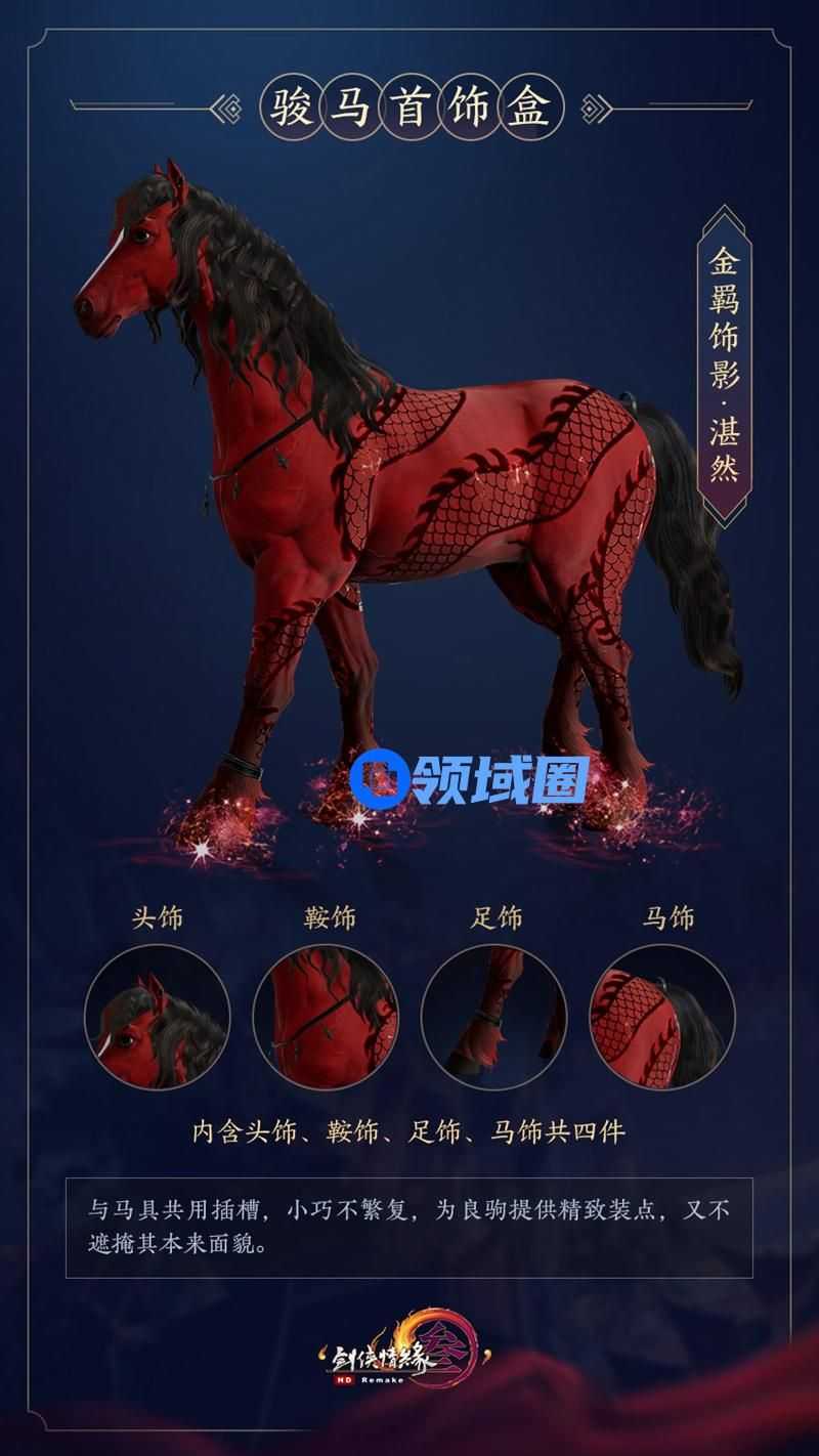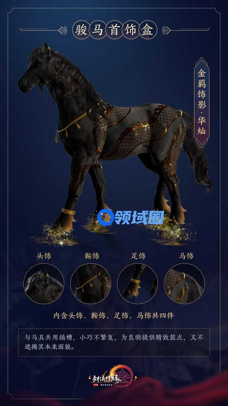 不仅如此,还有全新骏马首饰盒“金羁饰影”系列闪亮登场,为侠士们的爱驹提供精致点缀!骏马首饰盒“金羁饰影”系列共有三款不同偏色可供选择,每款偏色均内含头饰、鞍饰、足饰、马饰共四件,其中头饰、鞍饰、足饰三件均可为良驹提供【移动速度提高5%】的增益效果。首饰盒一改往日马具繁复冗杂之感,小巧清丽,既可为侠士的爱驹提供画龙点睛的点缀,又不遮掩其本来面貌,尽情展现良骏风范!