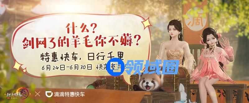 特惠快车,日行千里,《剑网3》携手滴滴特惠快车,为各位侠士们送上专属出行礼包!滴滴特惠快车6折起大酬宾,国内享受滴滴服务范围内皆可使用,让你的出行又快又实惠!即日起至6月30日23:00,侠士们前往专题页面即可领取《剑网3》专属滴滴出行礼包!
