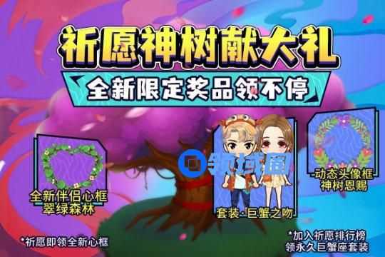 活动期间,来“祈愿神树”祈愿吧!这里有超多的礼物等着你,包含:全新伴侣心框·翠绿森林!祈愿次数越多,可领取的奖励越多!并且,活动结束后,为祈愿排行榜上前100名玩家发放额外奖励,包含祈愿金币返利、巨蟹之吻全新套装等!