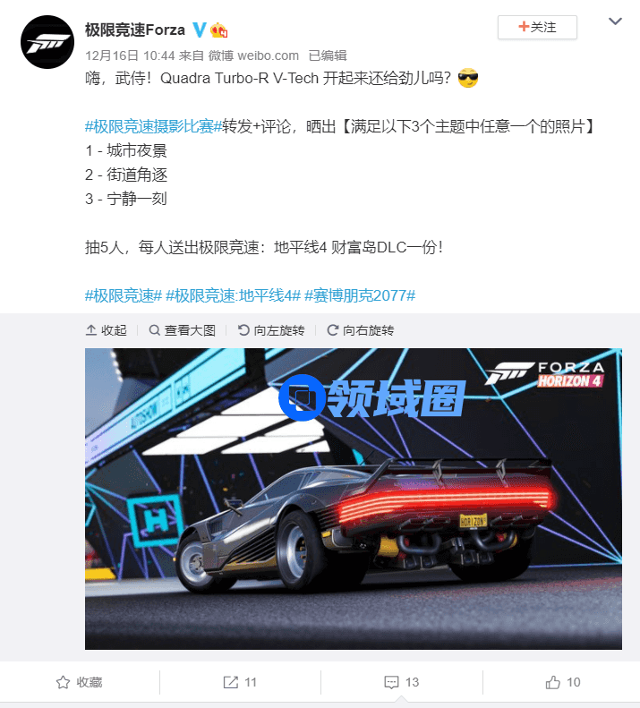 除了限时折扣外,你还可以通过参与微博活动,自带话题#极限竞速摄影比赛#,围绕着城市夜景、街道角逐、宁静一刻为主题转发+评论@极限竞速Forza的活动微博,赢取《极限竞速:地平线4》财富岛DLC一份,让你在新的一年,惊喜不停!
