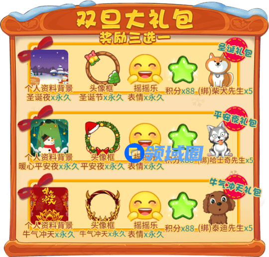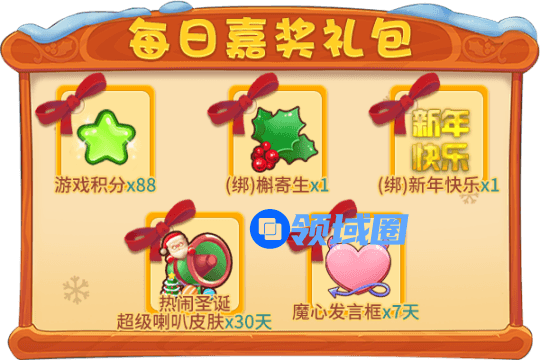 每局累计获得5份奖励:额外随机赠送一份:圣诞礼物、舞狮、爱吻卡