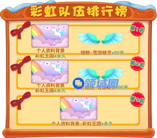 活动结束后,为三支队伍按总彩虹值进行排名,然后分别为排名前三的队伍内所有成员发放奖励!