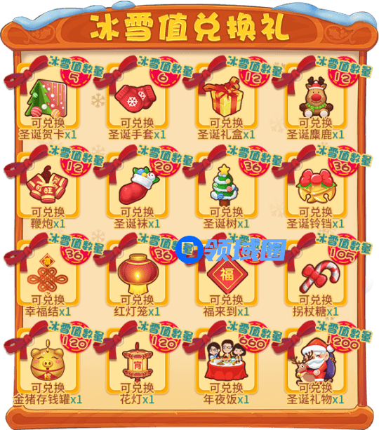 活动期间,将您的道具换成“冰雪值”吧!使用“冰雪值”,兑换圣诞和新年好礼!