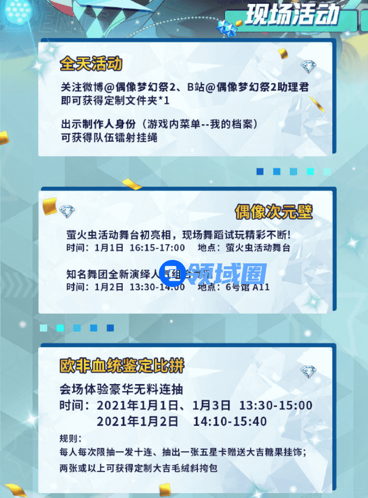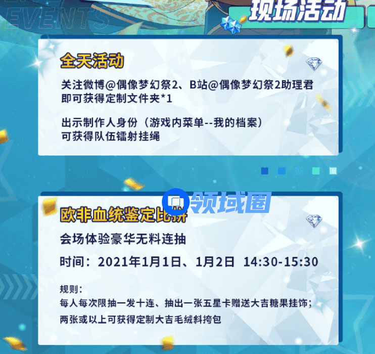 在2021年1月1日~2日漫展期间,关注《偶像梦幻祭2》官方微博@偶像梦幻祭2、B站@偶像梦幻祭2助理君,即可获得定制文件夹*1。同时,现场点击游戏内菜单-我的档案,向工作人员出示制作人身份,即可获得队伍镭射挂绳!