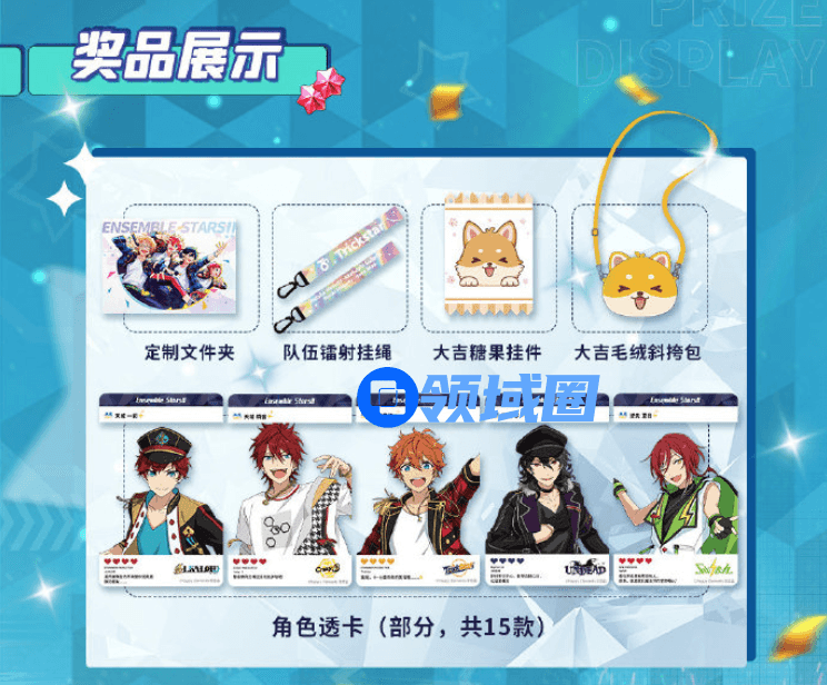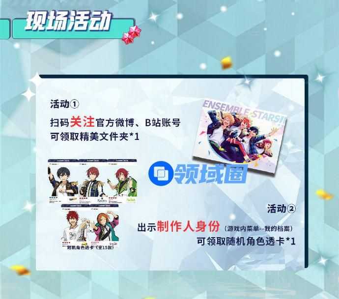 漫展期间,关注《偶像梦幻祭2》官方微博@偶像梦幻祭2、B站@偶像梦幻祭2助理君,即可获得定制文件夹*1。同时,现场点击游戏内菜单-我的档案,向工作人员出示制作人身份,即可获得随机角色透卡*1。期待各位制作人的踊跃参与!