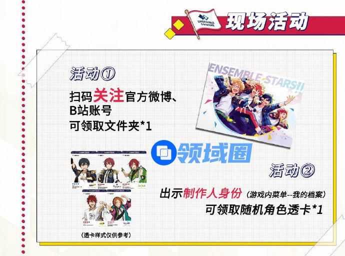 漫展期间,关注《偶像梦幻祭2》官方微博@偶像梦幻祭2、B站@偶像梦幻祭2助理君,即可获得定制文件夹*1。同时,现场点击游戏内菜单-我的档案,向工作人员出示制作人身份,即可获得随机角色透卡*1。
