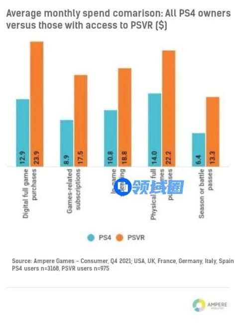 Ampere研究游戏团队负责人皮尔斯·哈丁-罗斯(Piers Harding-Rolls)指出,在所有PS4用户中,只有不到5%购买了初代PSVR。不过,PSVR用户往往比PS4用户更活跃,用于游戏的开销也更高(详见上图)。