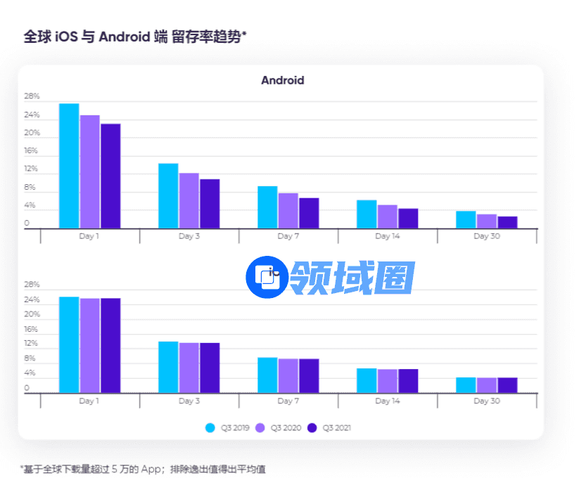 报告显示,2021年过去三个季度中,安卓端留存率呈稳步下滑趋势。2021年第三季度,安卓端第 14日留存率为4.3%,同比下降15.4%,第30日留存率降幅达16%,但这与去年留存率相比降幅并不明显,可见留存率和活跃度降低是安卓端应用开发者不得不面对的现实。