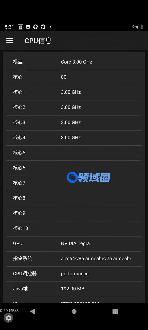 我体验到的云手机的配置信息如图,系统是原生的AOSP安卓9,硬件信息显示叫UPhone X on ARM 64,这是云手机服务的名字,用软件查看一下CPU的信息,只知道是4核配置,全四核都是3G Hz的主频!