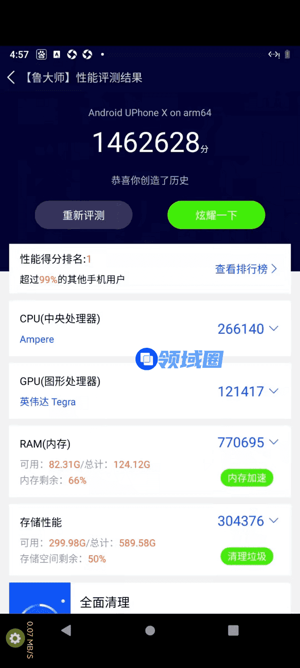 系统识别是80核心,但跑分中实际只用到了4核,系统显示的124G DDR4 3200服务器内存,其实只用到了5G,服务器的内存比手机的内存可快得多。存储方面,使用的是500G的闪存盘。GPU用的是一块完整的英伟达Tegra独立显卡。