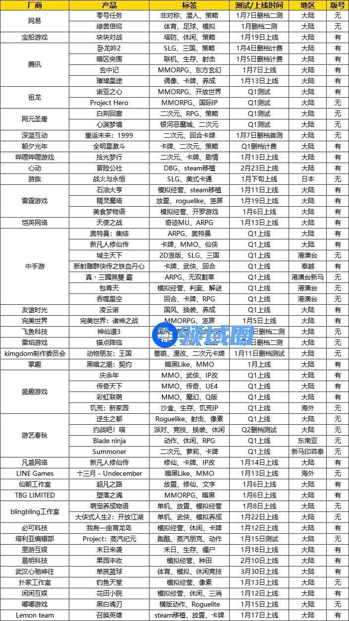 其中腾讯有两款产品1月就会上线:MMORPG《玄中记》和娱乐圈模拟经营《璀璨星途》。生存射击《暗区突围》和SLG《卧龙吟2》也来到了付费测的阶段,且都有版号,有机会在年内上线。
