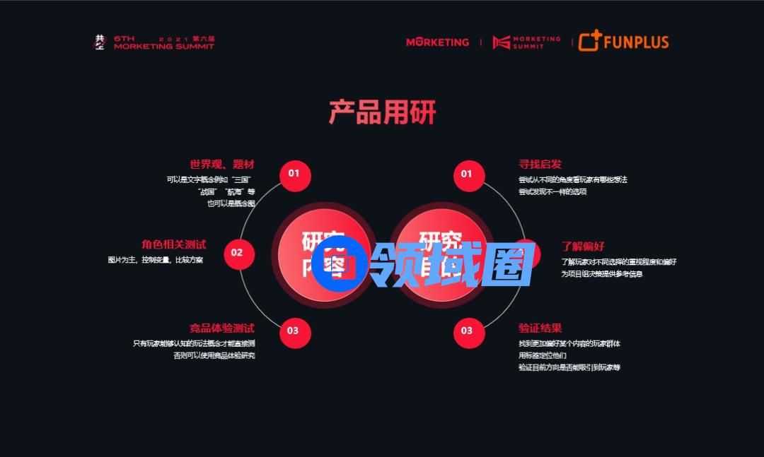 第一,通过对市面上现有产品的进行调研及数据归纳,定期进行品类研究的输出,帮助项目组了解品类内的玩法变化与发展趋势,为后续产品玩法微调提供信息;第二,通过对题材的深入探索,在大题材下找到可以继续深挖、放大的内容元素,为产品老题材焕新提供思路;第三,通过持续的竞品研究,保持研究人员对对业内产品敏感度,同时为在研产品提供更多的玩法、市场参考信息;第四,全球画像研究,通过每年定期更新区域用户画像,帮助产品更好理解不同区域用户;第五,尖叫度测试验证,通过邀请核心玩家参与项目测试,帮助优化产品的核心玩法;第六,目标用户验证,在完成前期用户特征分析后,我们将对UA创意素材、新增游戏玩法进行目标用户验证,通过用户反馈,更直观的了解以上内容是否可以吸引到玩家。