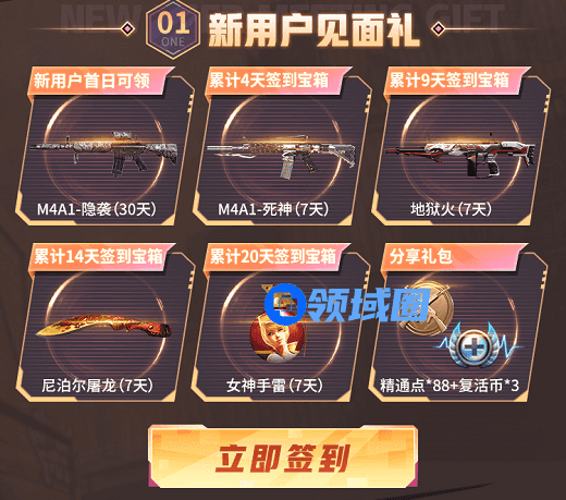 活动签到好礼,成功参与活动后,点击签到或分享礼包都能免费领取新用户见面礼,包含M4A1-隐袭(30天)、M4A1-死神(7天)、尼泊尔屠龙(7天)等等精美礼品。
