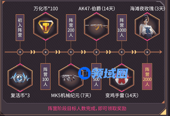 阵营分别到达100人、200人、500人、1000人和2000人时,对应解锁100万化币、MK5机械纪元(7天)、AK47-伯爵(14天)、变鸡手雷(14天)和海滩夜玫瑰(3天)!