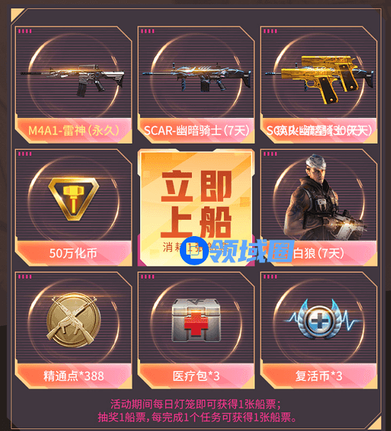 完成任务获得抽奖机会,可以在活动的抽奖环节进行抽奖,奖池尤为丰厚,包含永久的英雄级武器M4A1-雷神、SCAR-幽暗骑士(7天)、角色白狼(7天),以及其他丰厚的道具奖励!