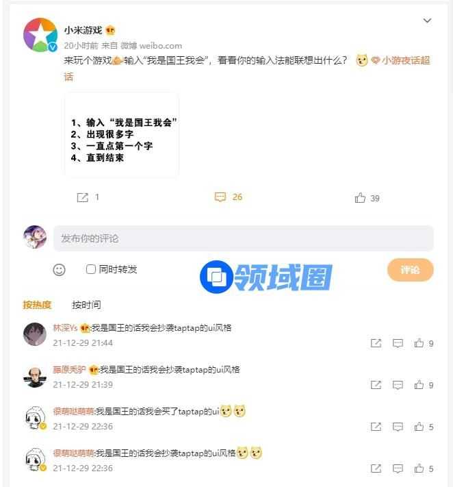有网友在小米游戏的官方账号下留言,通过模仿官方的微博文案来讽讽小米抄袭TapTap一事。