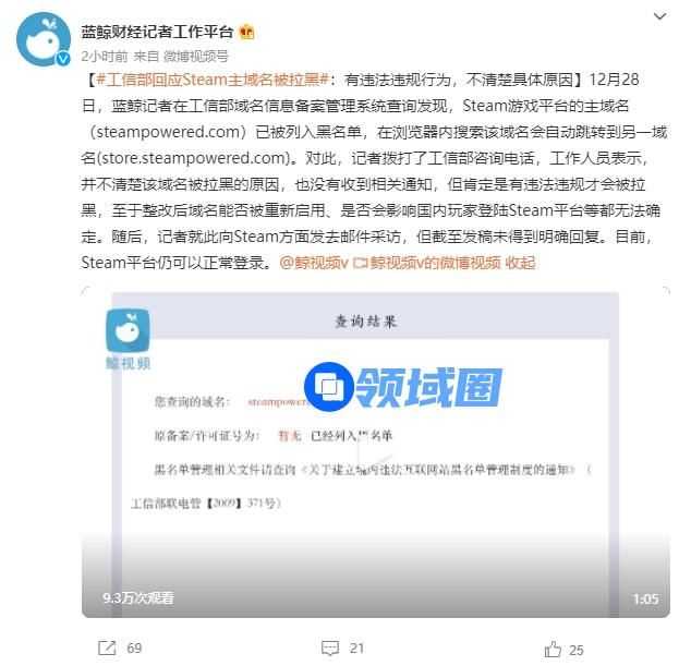 今天下午蓝鲸财经发了条微博。大意就是蓝鲸记者发现steampowered.com域名被列入工信部黑名单,然后打电话咨询工信部工作人员,一问三不知。结果在什么有效信息都没获得的情况下(甚至都不知道域名是多久被列入黑名单的),就写了个焦虑新闻。