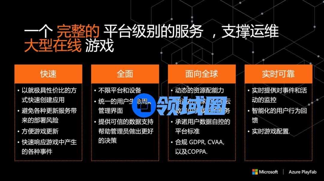 Azure PlayFab 是微软基于微软云 Microsoft Azure 在云端打造的可用于承载使用托管游戏服务、具有实时分析能力和 LiveOps 的实时运维后端平台,借此可有效提高游戏收入和高价值玩家的参与度和忠诚度,并降低运维成本。