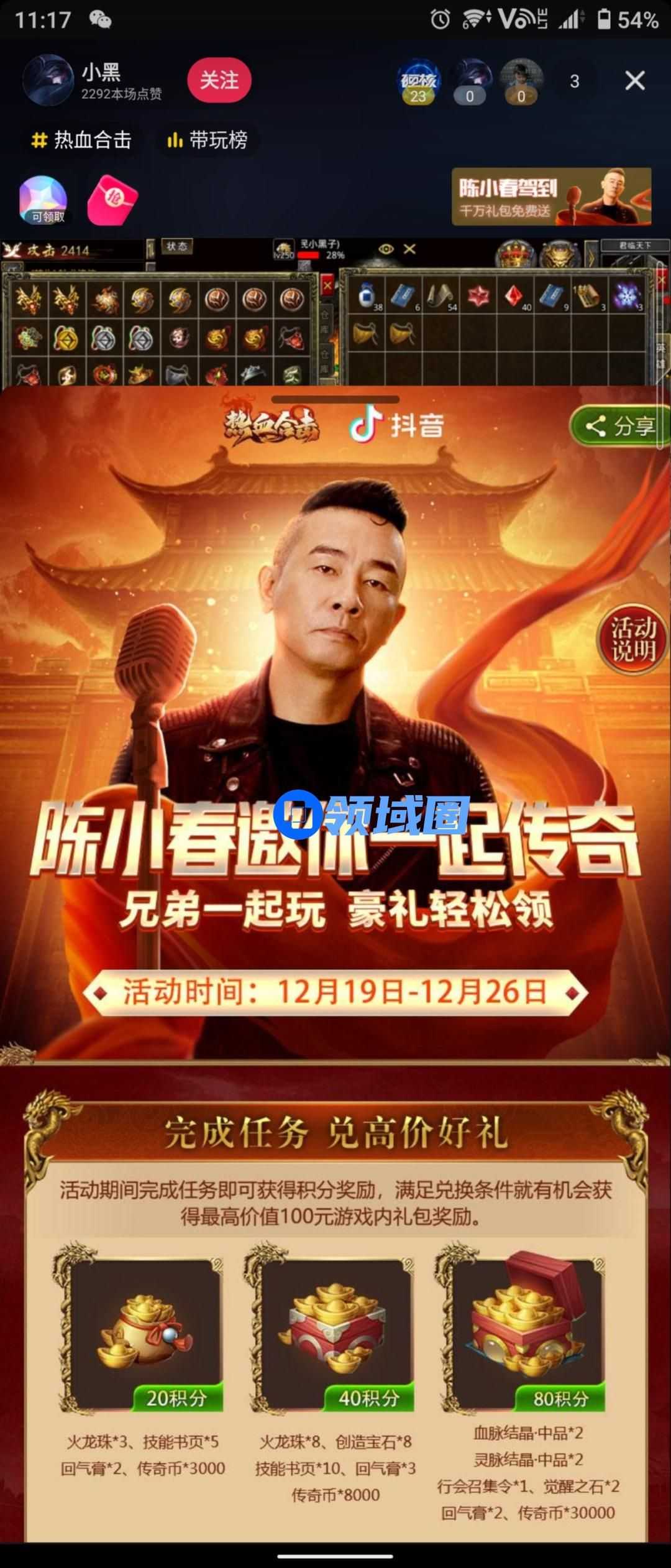 陈小春作为代言人直播带玩《热血合击》,他身上的硬汉、兄弟属性完美契合传奇类游戏的风格调性,其标志性的墨镜港风变装更是一下子就抓住了目标用户的感情,这为直播间的氛围与留存提供了好的铺垫。