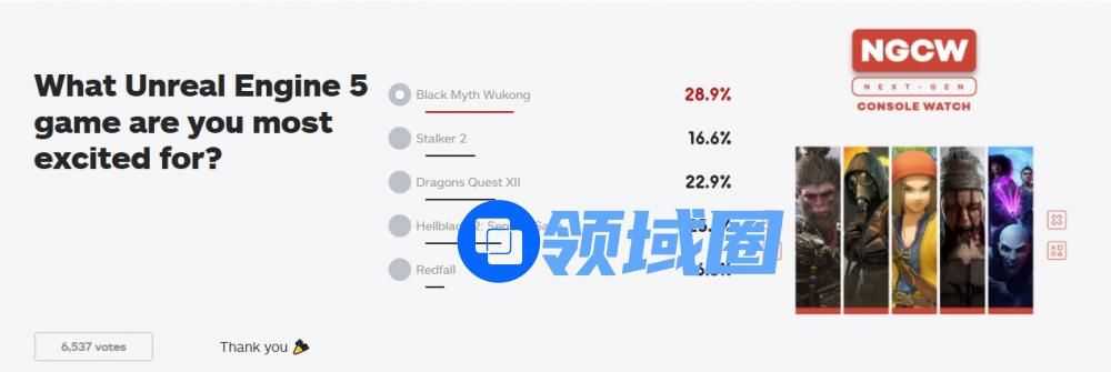 近日,IGN于官网上线了全新投票活动,玩家可以投票出一款自己期待的、采用虚幻5引擎开发的新游戏,其中包括国产神话题材动作游戏《黑神话:悟空》、生存射击游戏《潜行者2》、DQ系列最新作《勇者斗恶龙12》、生存解密游戏《地狱之刃2》和贝塞斯达Xbox独占射击游戏《猩红陷落》。